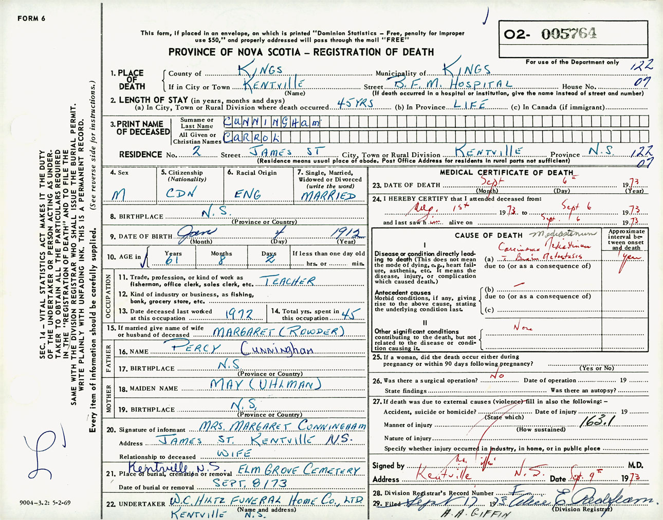 Male Death Registration: Year: 1973 number: 5764