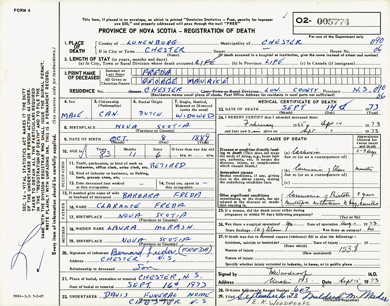 Male Death Registration: Year: 1973 number: 5774