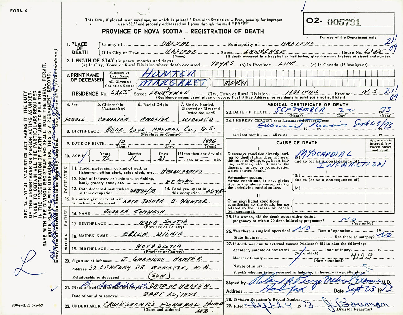 Female Death Registration: Year: 1973 number: 5791