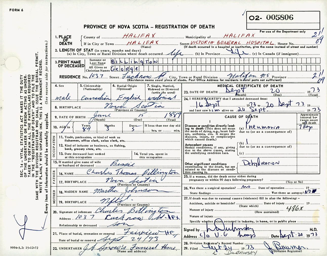 Male Death Registration: Year: 1973 number: 5806