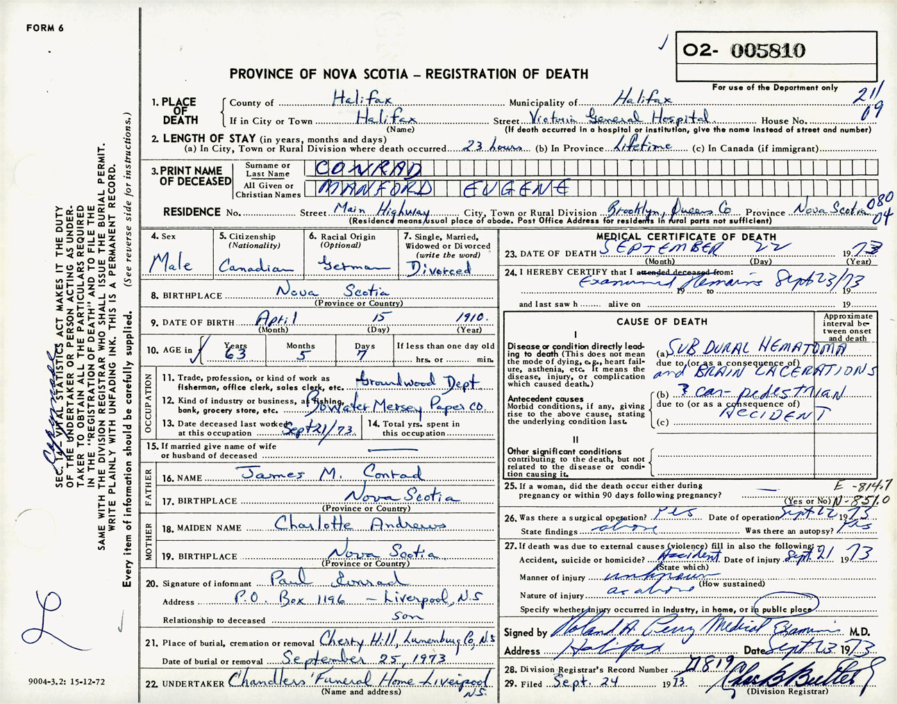 Male Death Registration: Year: 1973 number: 5810