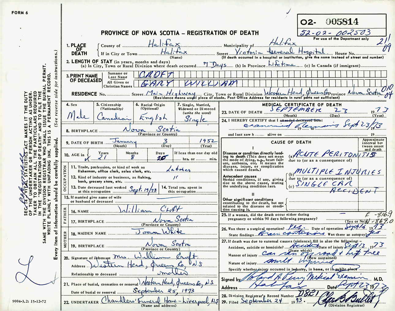 Male Death Registration: Year: 1973 number: 5814