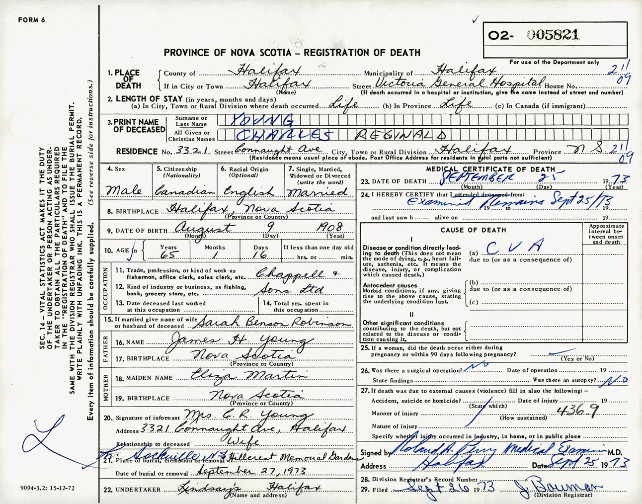Male Death Registration: Year: 1973 number: 5821