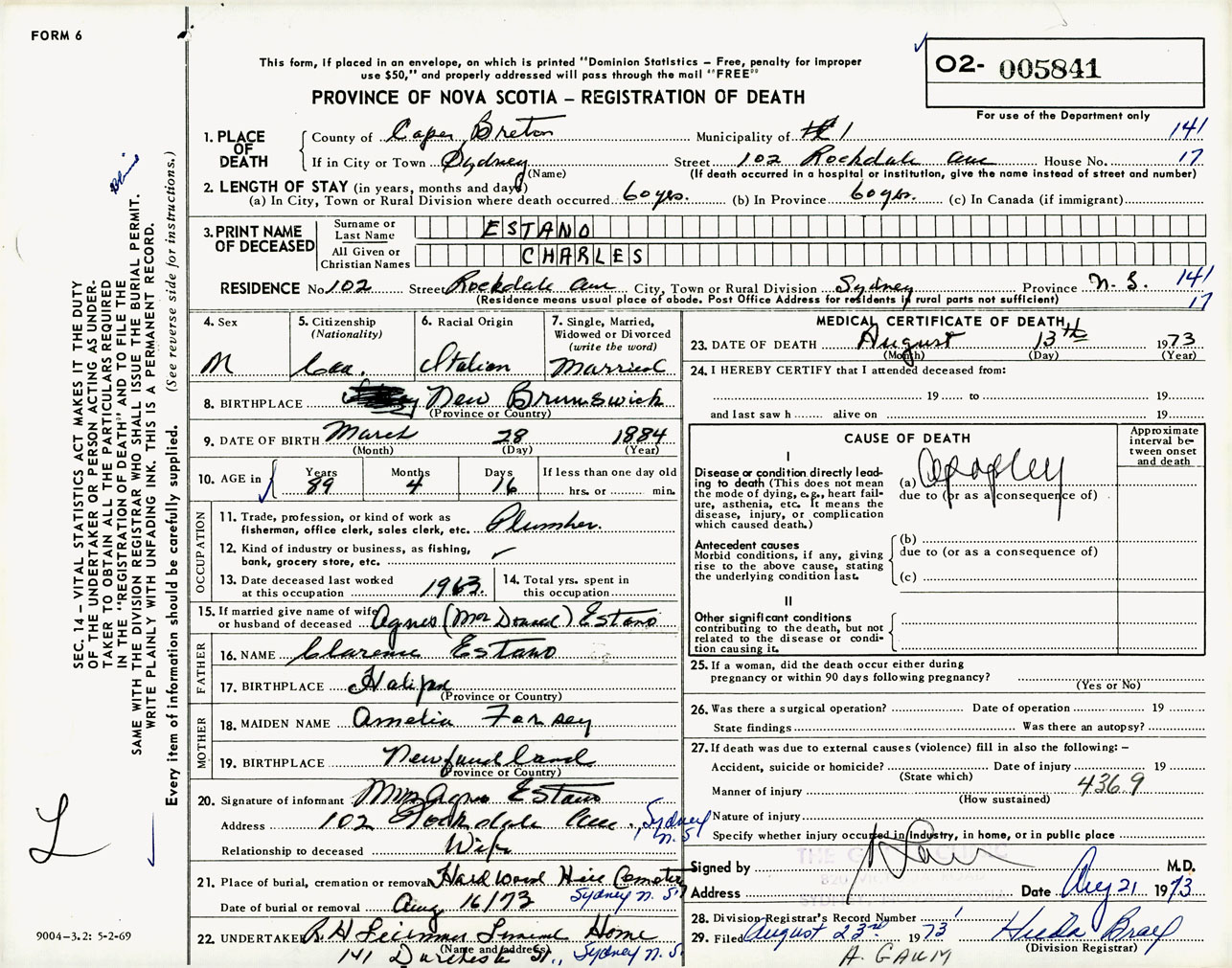 Male Death Registration: Year: 1973 number: 5841