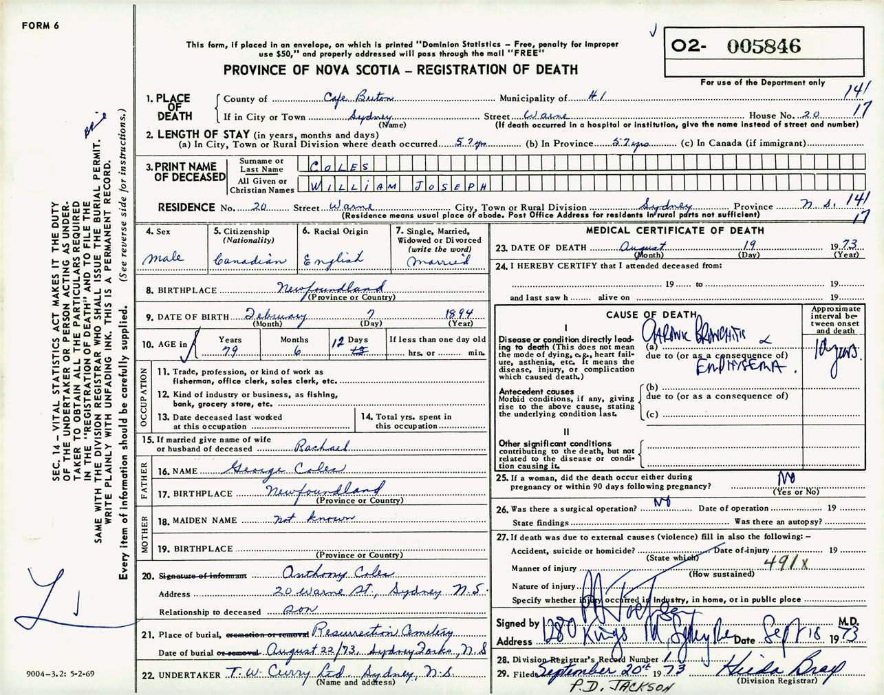 Male Death Registration: Year: 1973 number: 5846