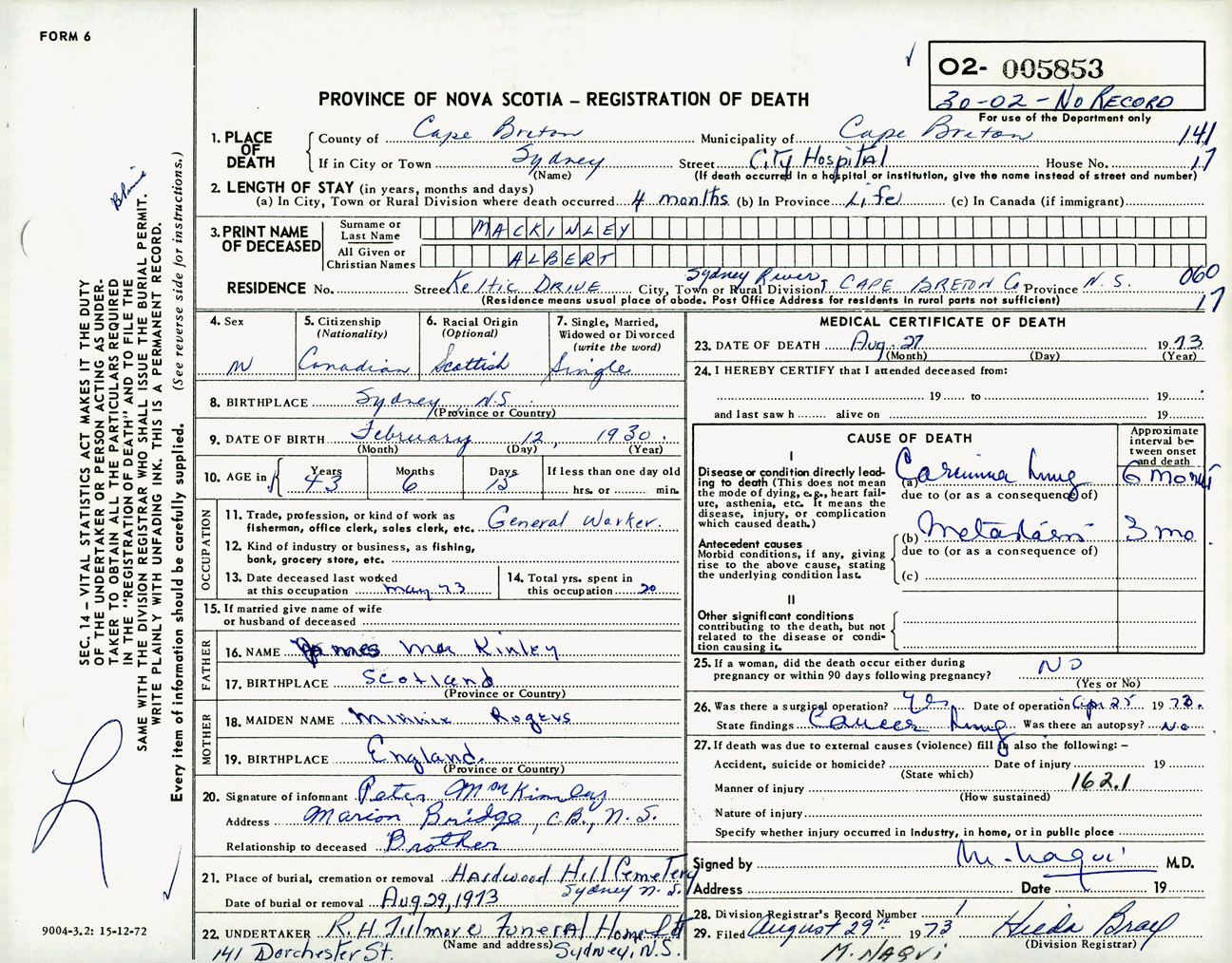 Male Death Registration: Year: 1973 number: 5853