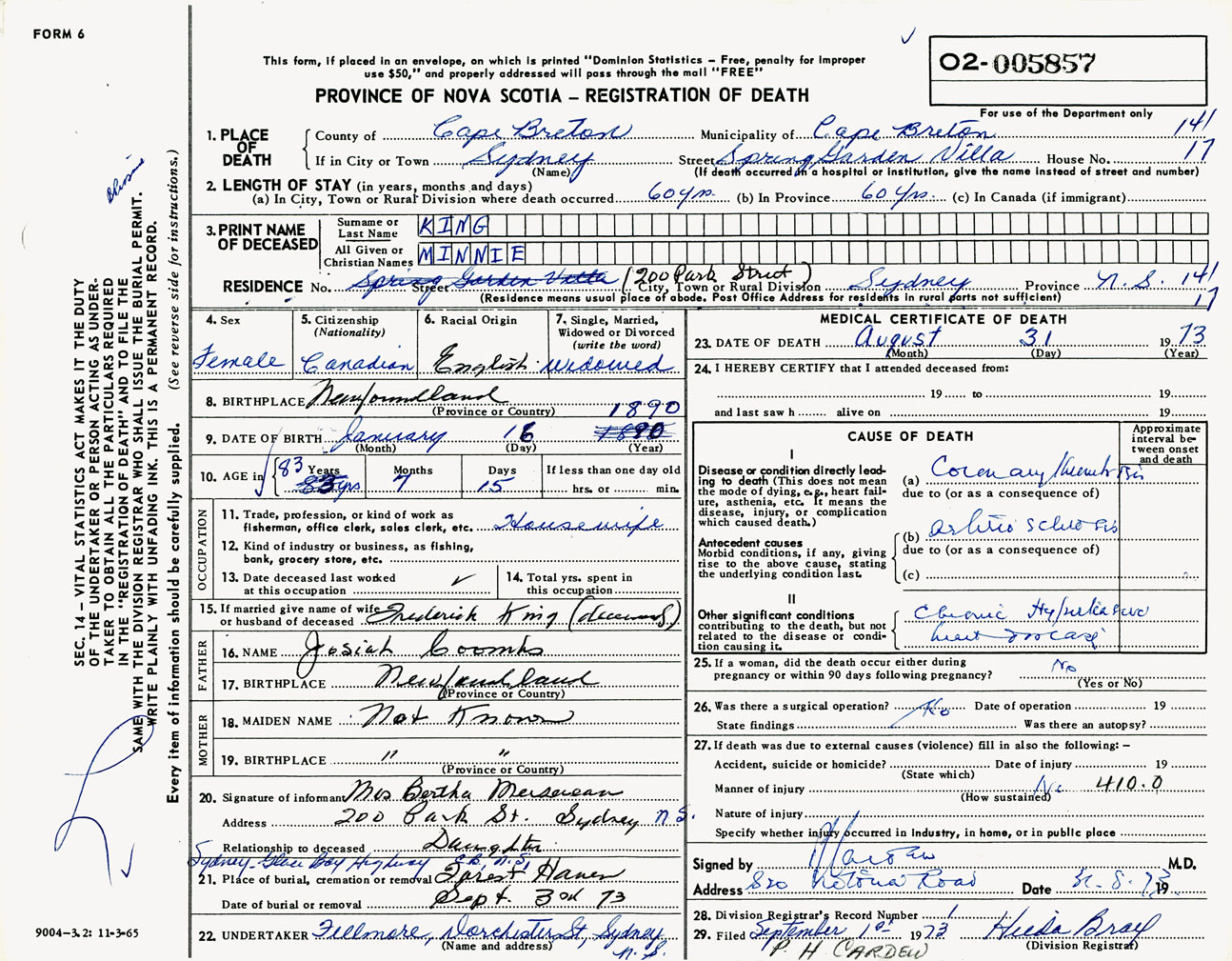 Female Death Registration: Year: 1973 number: 5857