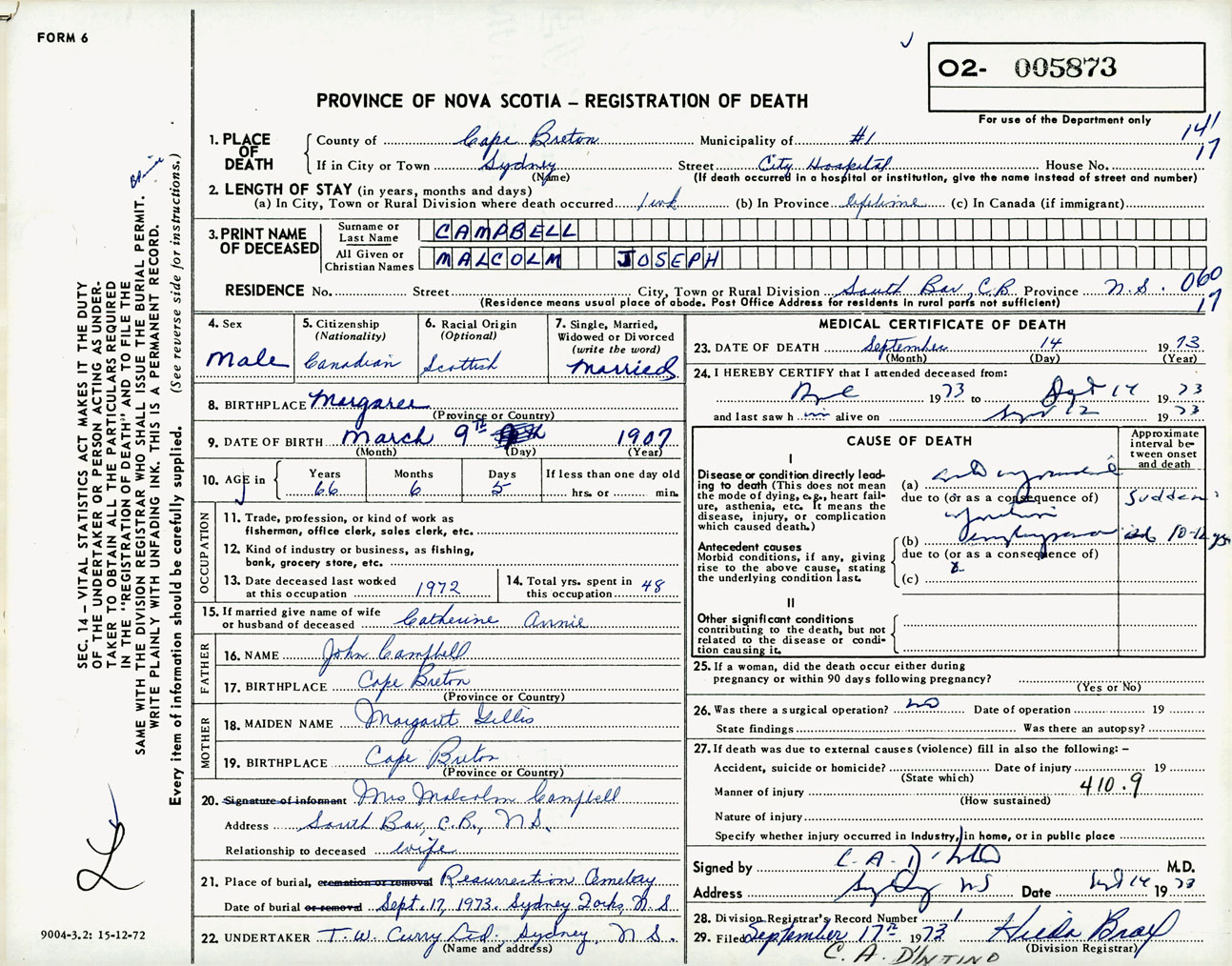 Male Death Registration: Year: 1973 number: 5873