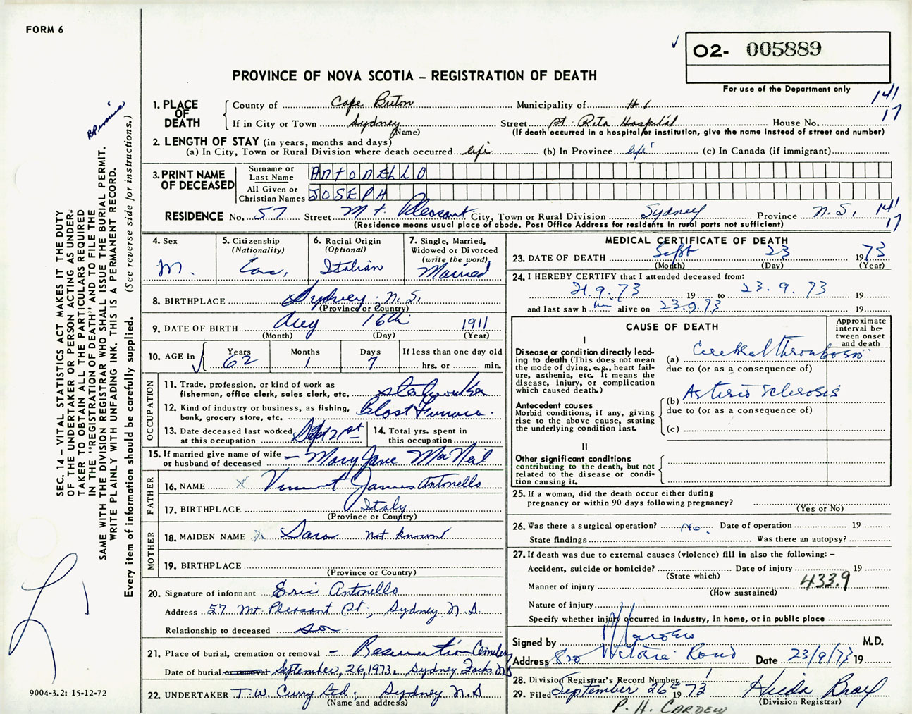 Male Death Registration: Year: 1973 number: 5889