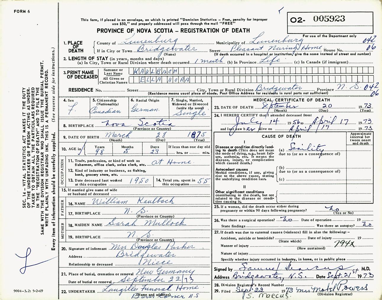 Female Death Registration: Year: 1973 number: 5923