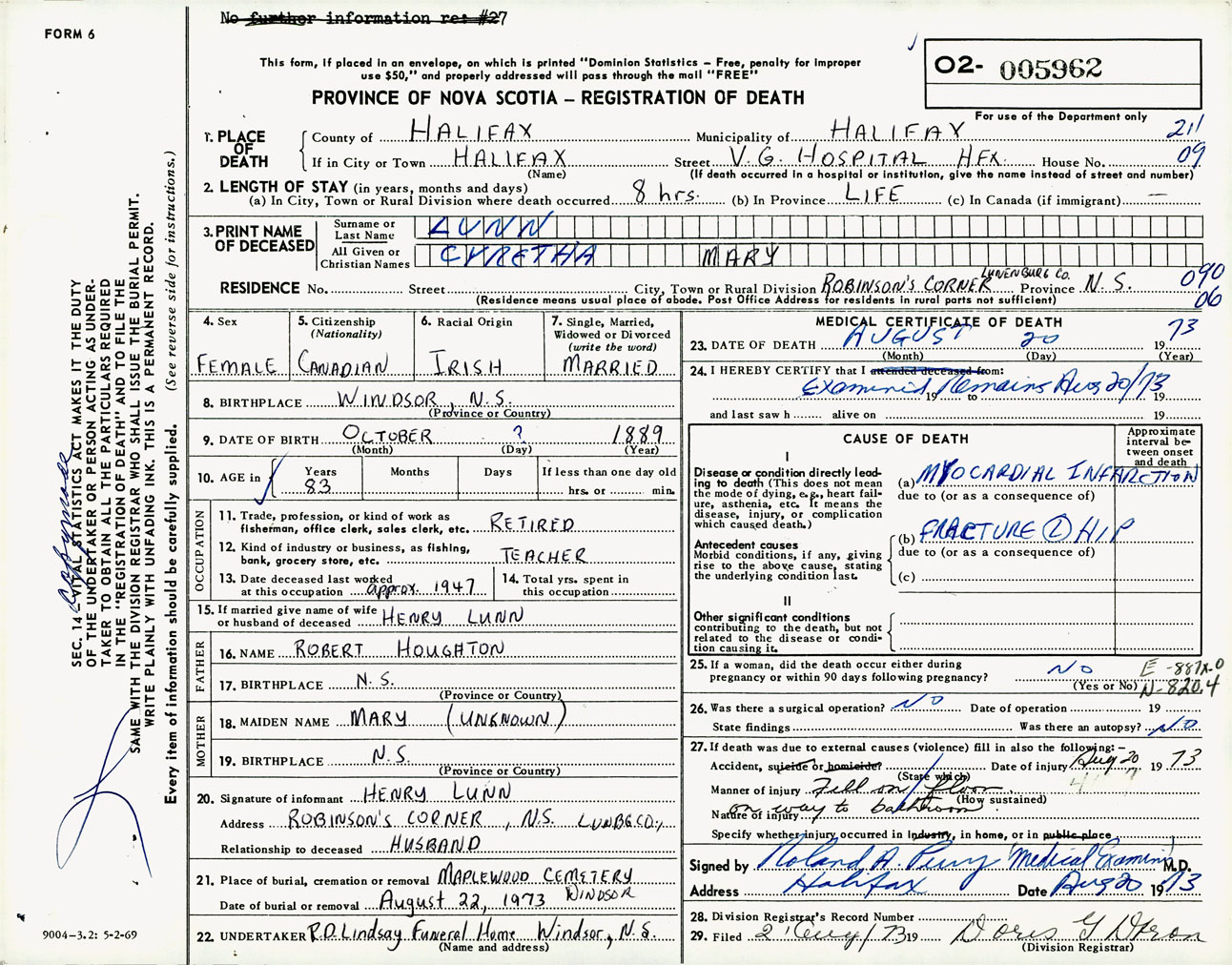 Female Death Registration: Year: 1973 number: 5962