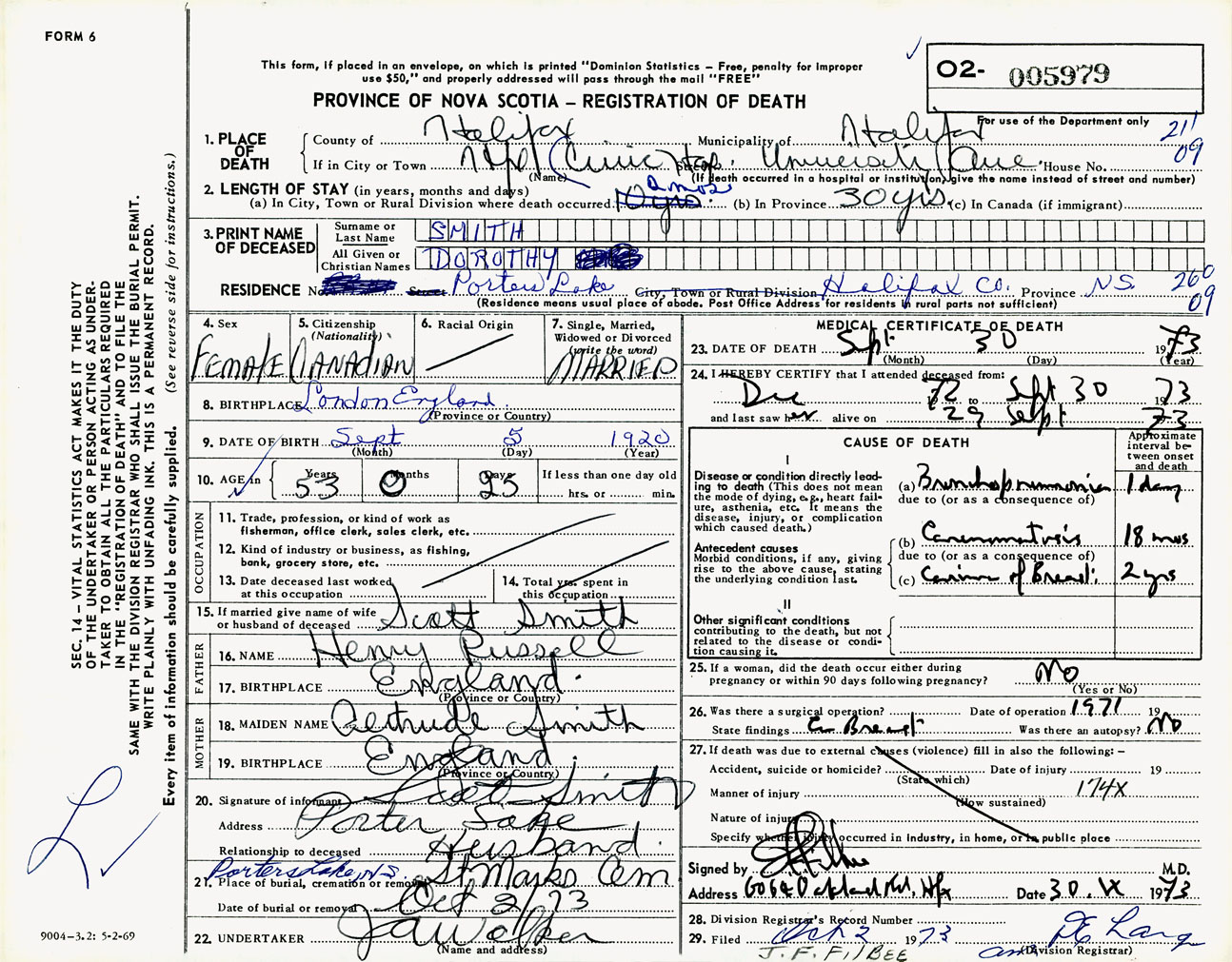 Female Death Registration: Year: 1973 number: 5979