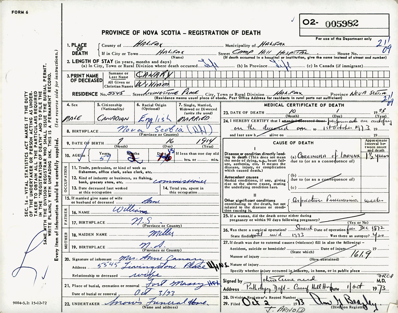 Male Death Registration: Year: 1973 number: 5982