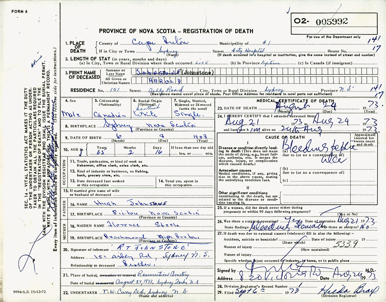 Male Death Registration: Year: 1973 number: 5992