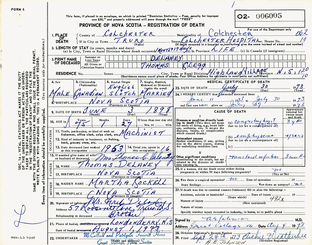 Male Death Registration: Year: 1973 number: 6005