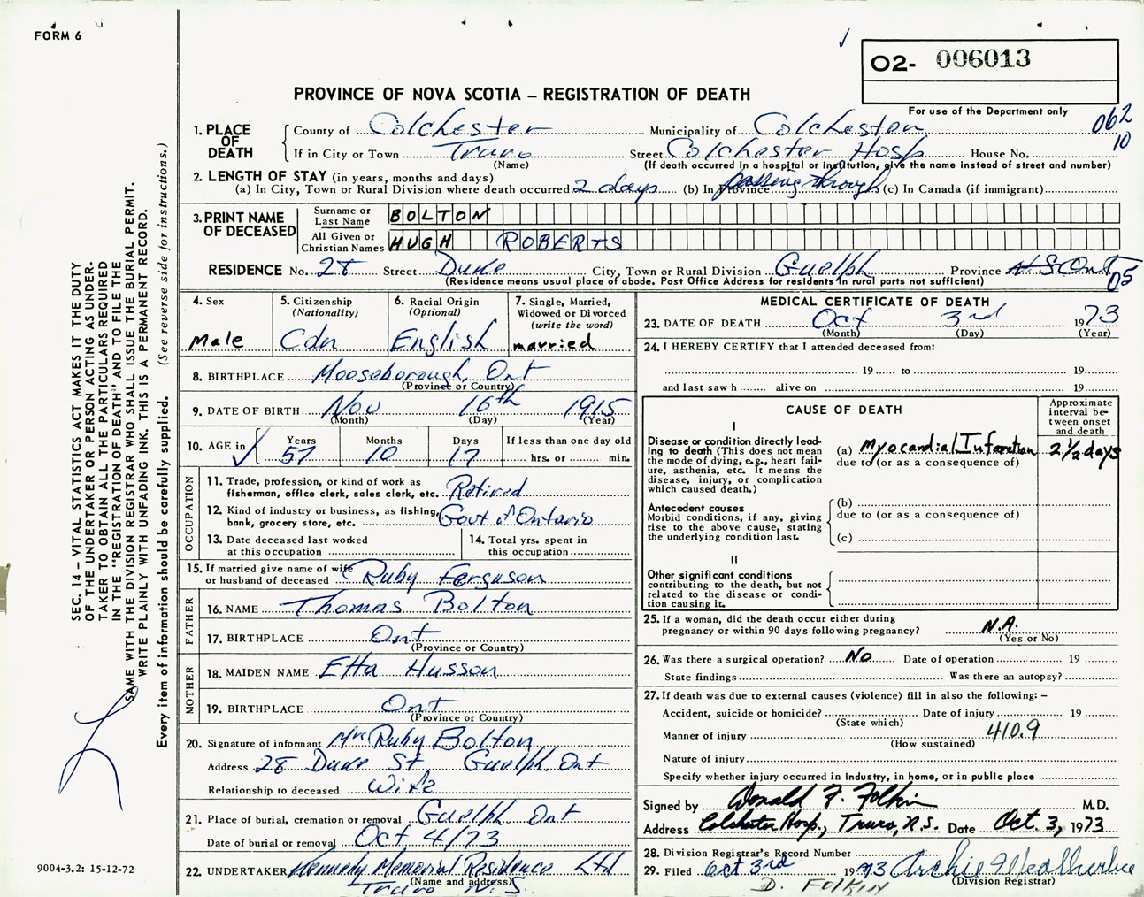 Male Death Registration: Year: 1973 number: 6013