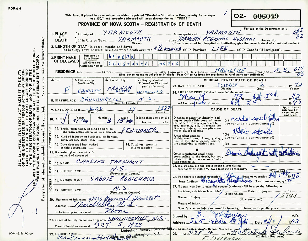 Female Death Registration: Year: 1973 number: 6049