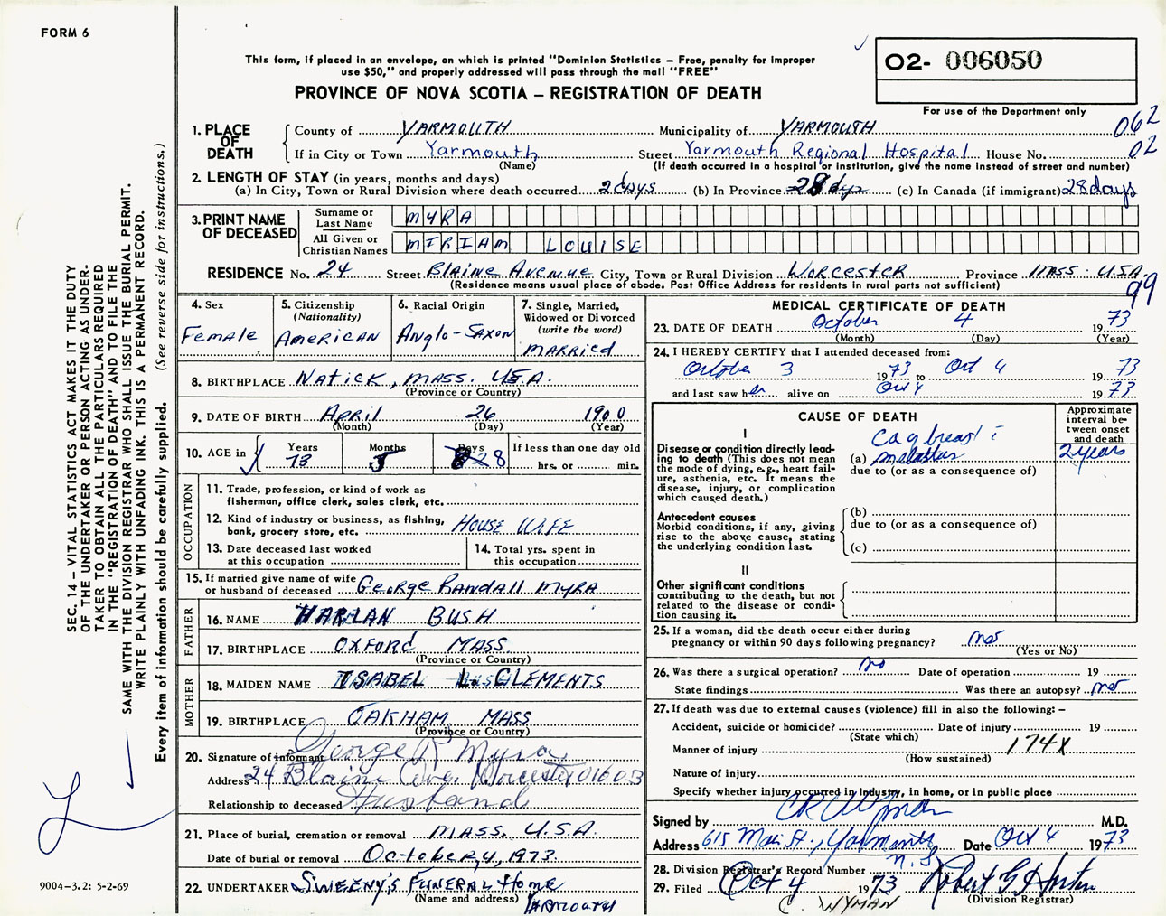 Female Death Registration: Year: 1973 number: 6050