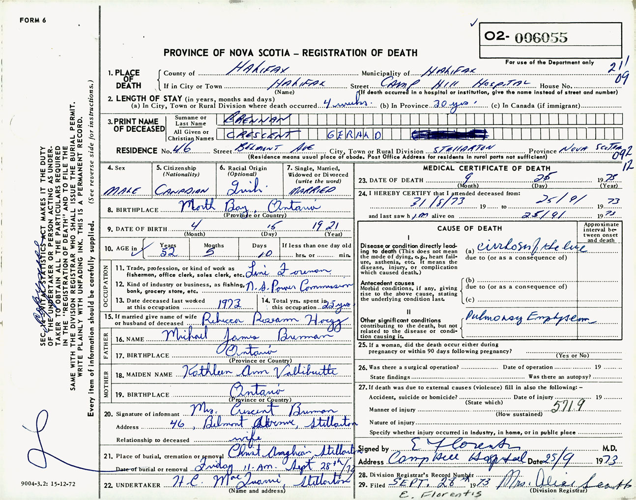 Male Death Registration: Year: 1973 number: 6055