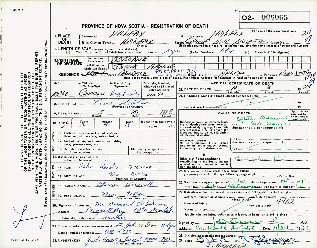 Male Death Registration: Year: 1973 number: 6065