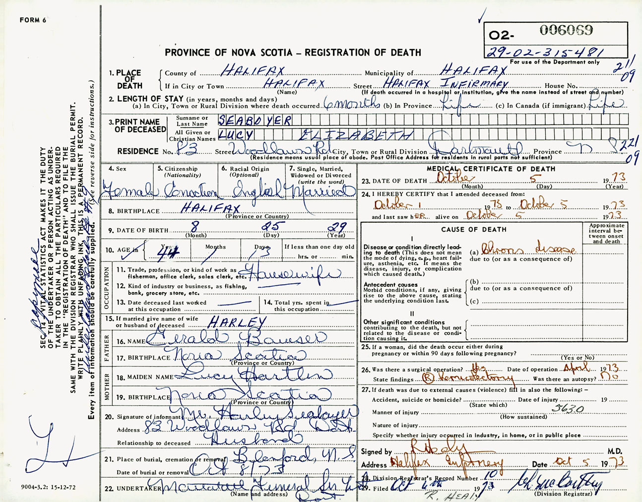 Female Death Registration: Year: 1973 number: 6069