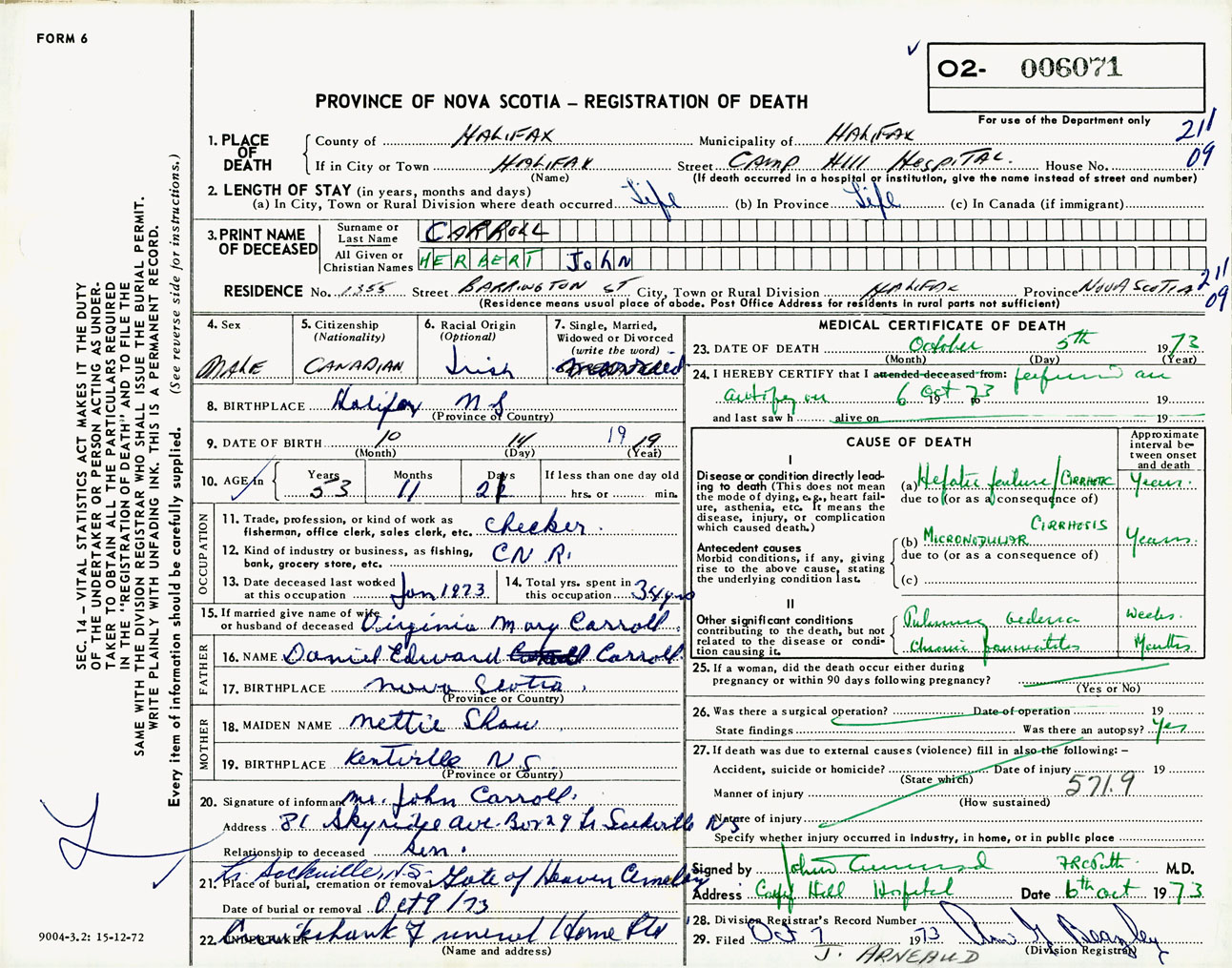 Male Death Registration: Year: 1973 number: 6071
