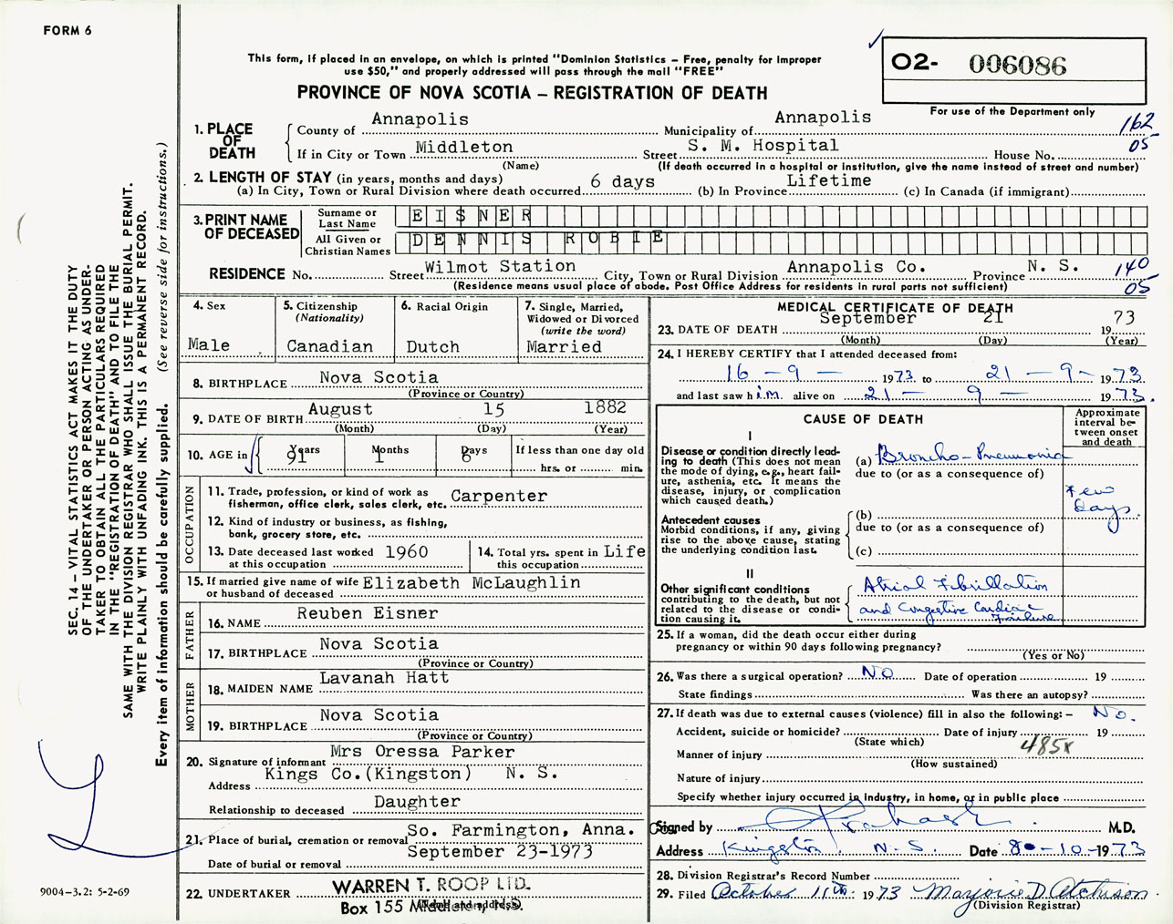 Male Death Registration: Year: 1973 number: 6086