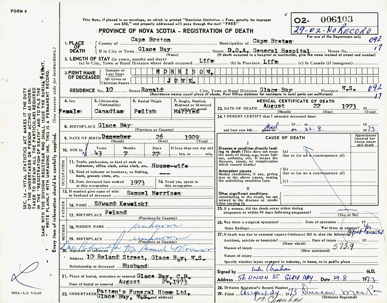 Female Death Registration: Year: 1973 number: 6103