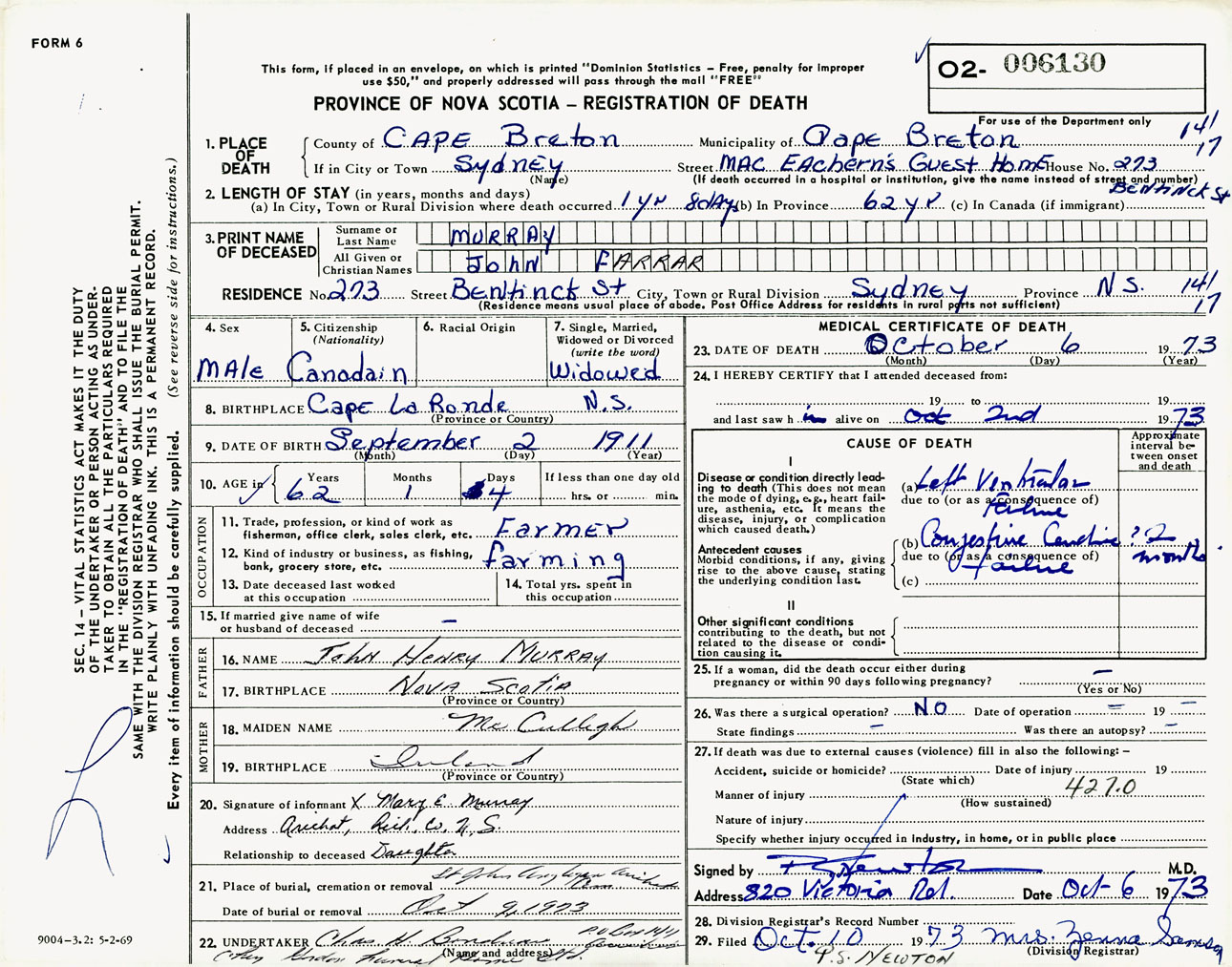 Male Death Registration: Year: 1973 number: 6130