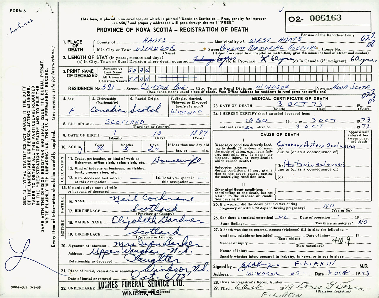 Female Death Registration: Year: 1973 number: 6163