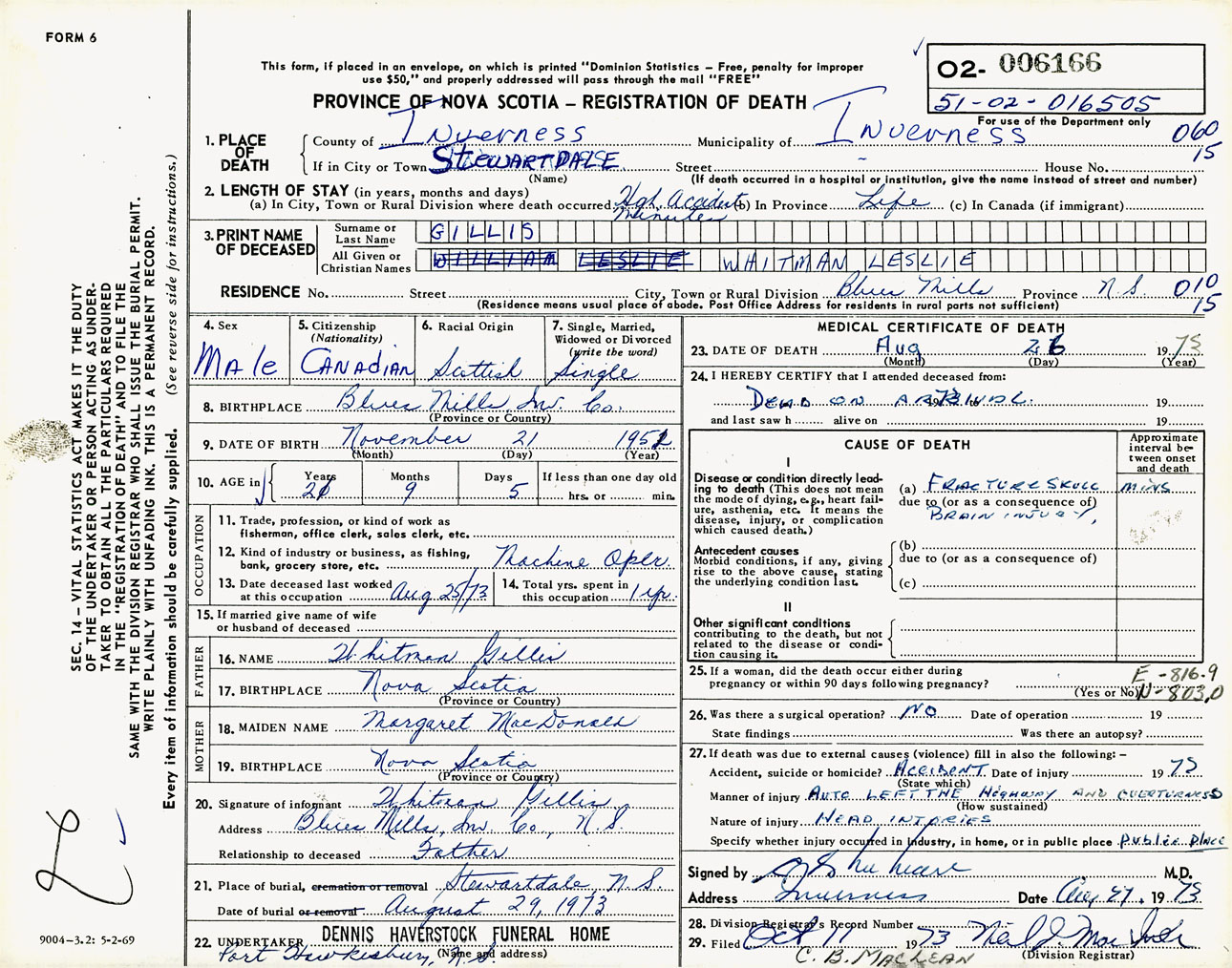Male Death Registration: Year: 1973 number: 6166