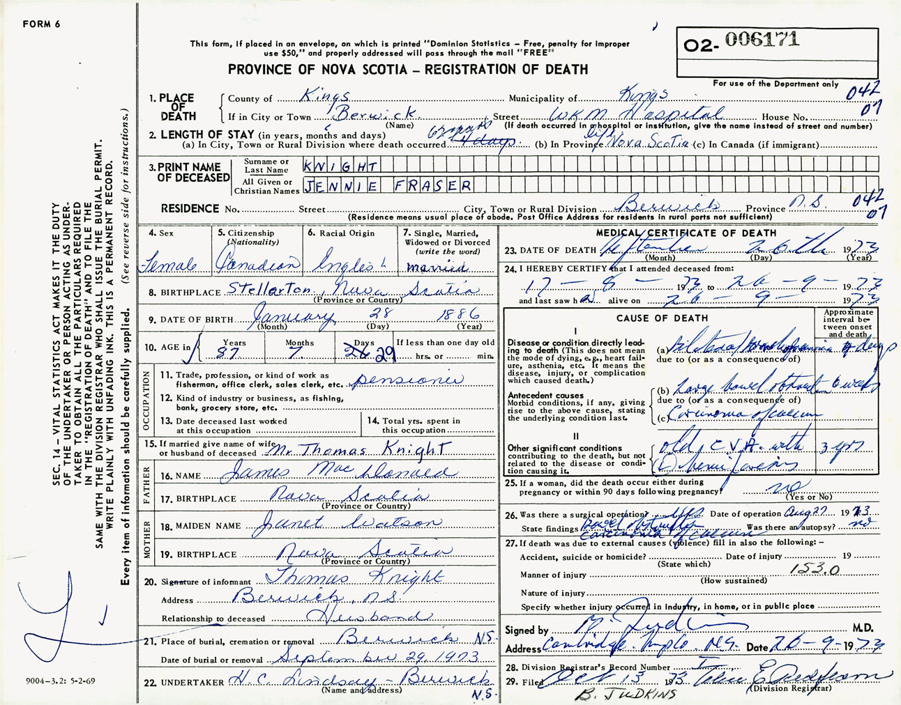 Female Death Registration: Year: 1973 number: 6171