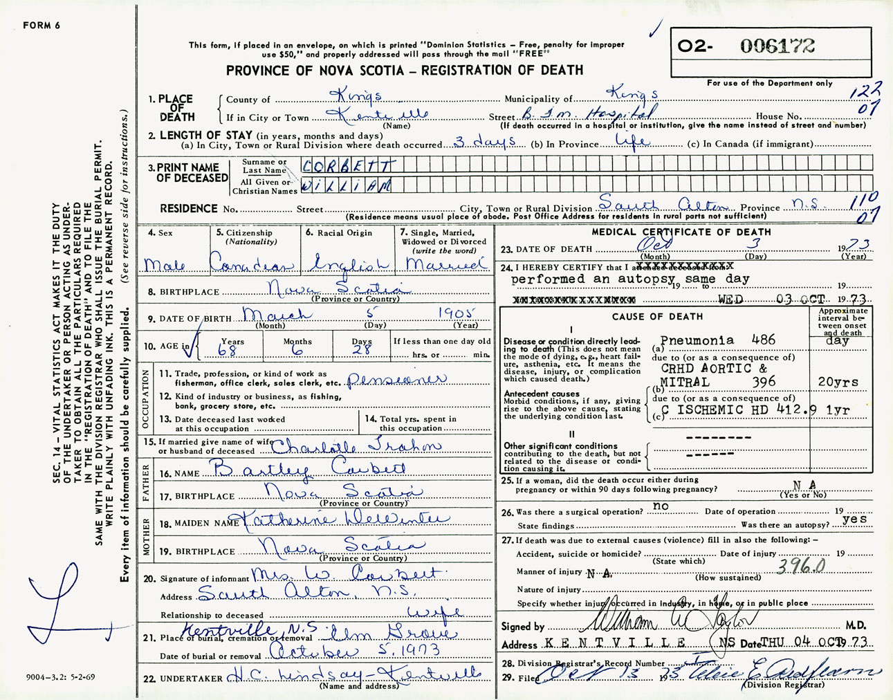 Male Death Registration: Year: 1973 number: 6172