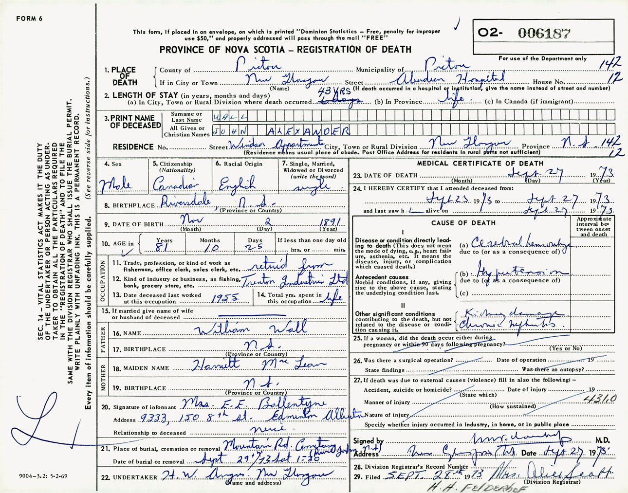 Male Death Registration: Year: 1973 number: 6187