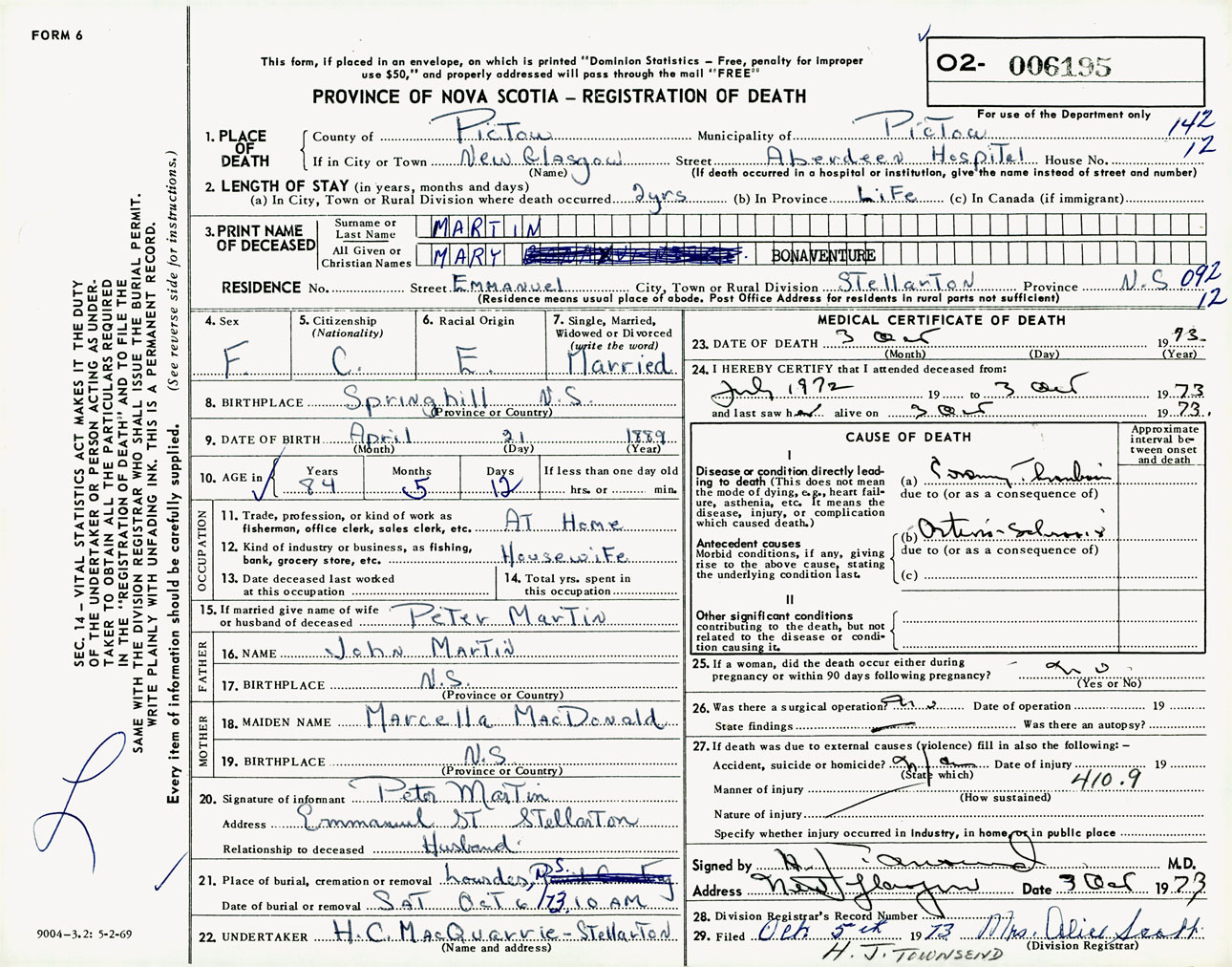 Female Death Registration: Year: 1973 number: 6195