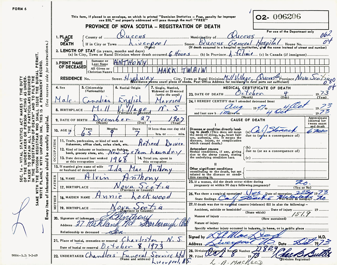 Male Death Registration: Year: 1973 number: 6206