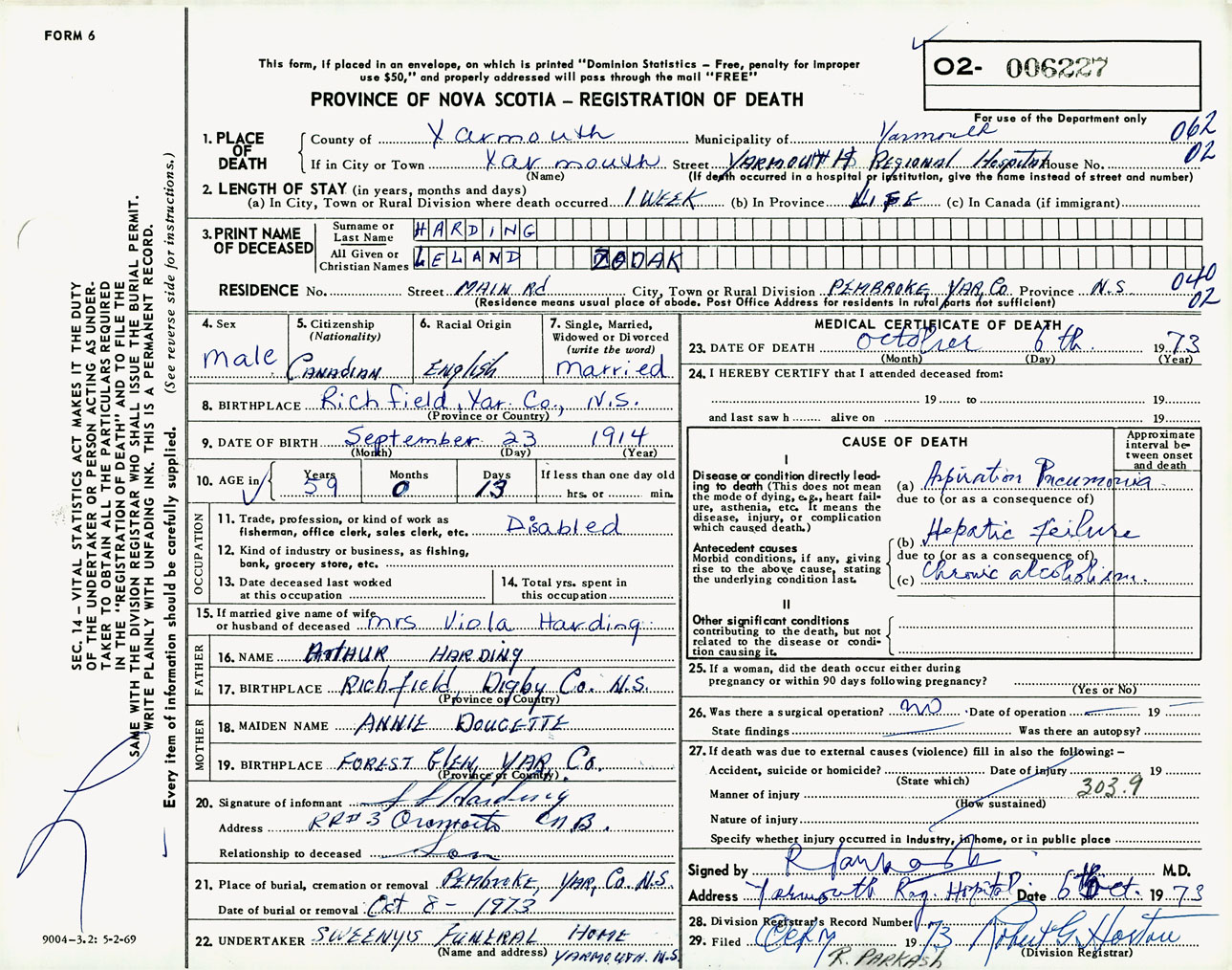 Male Death Registration: Year: 1973 number: 6227