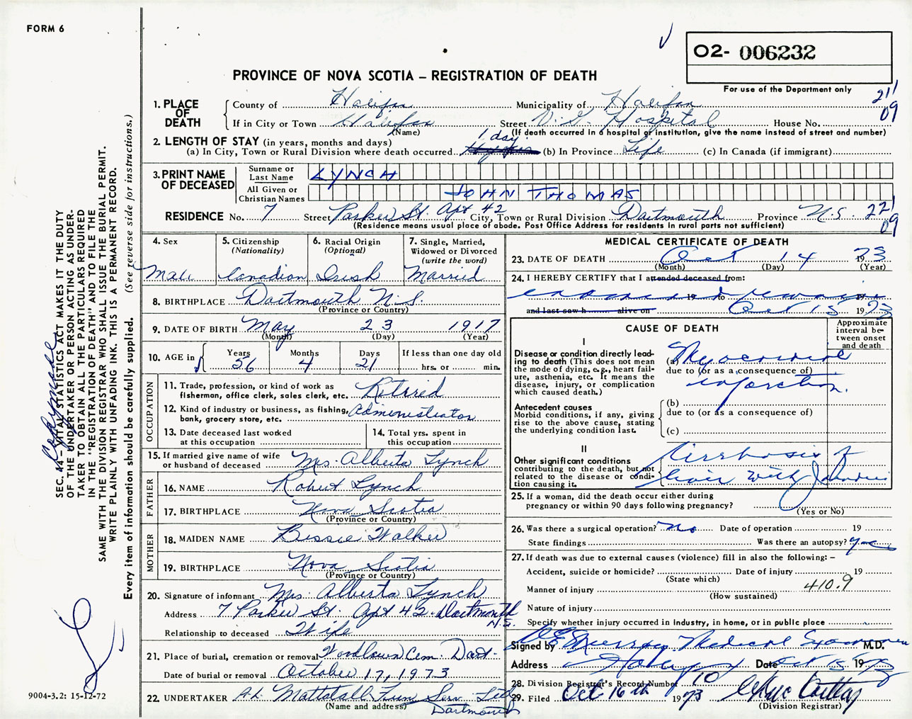Male Death Registration: Year: 1973 number: 6232