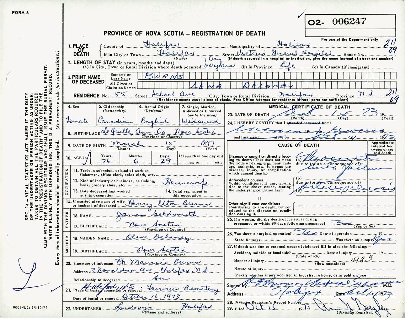 Female Death Registration: Year: 1973 number: 6247