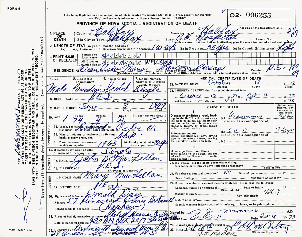 Male Death Registration: Year: 1973 number: 6255