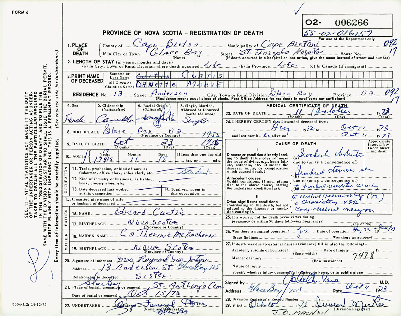 Female Death Registration: Year: 1973 number: 6266
