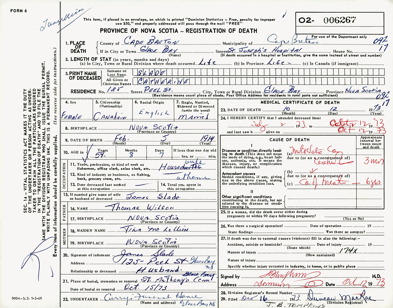 Female Death Registration: Year: 1973 number: 6267