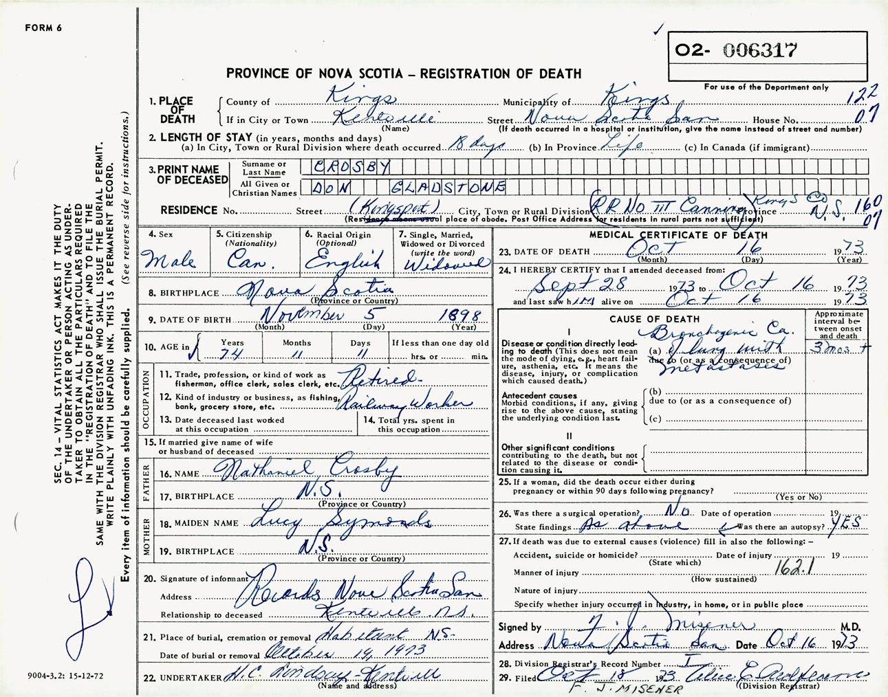Male Death Registration: Year: 1973 number: 6317