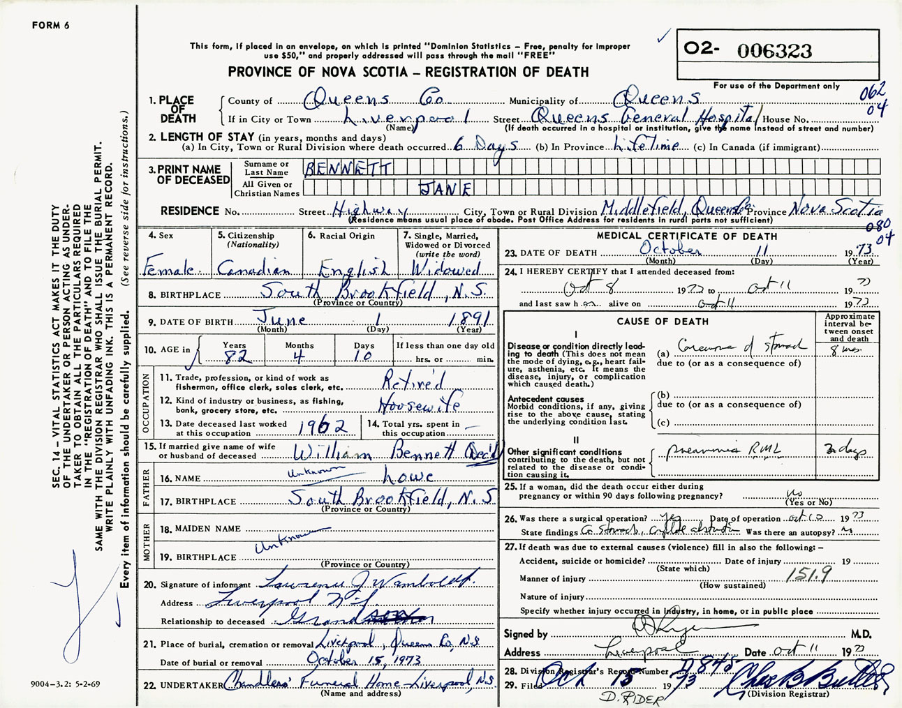 Female Death Registration: Year: 1973 number: 6323