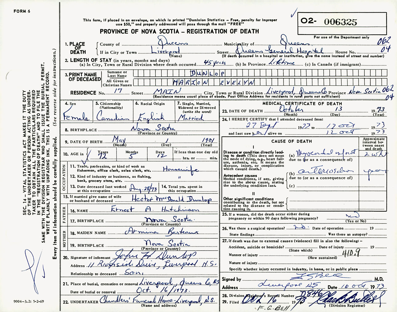 Female Death Registration: Year: 1973 number: 6325