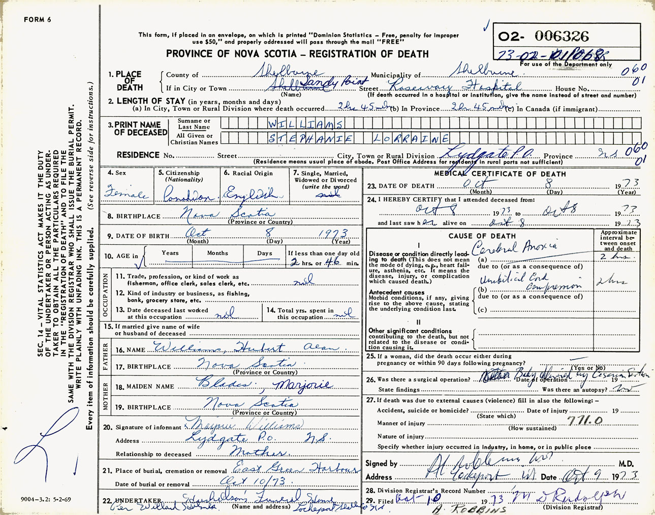 Female Death Registration: Year: 1973 number: 6326
