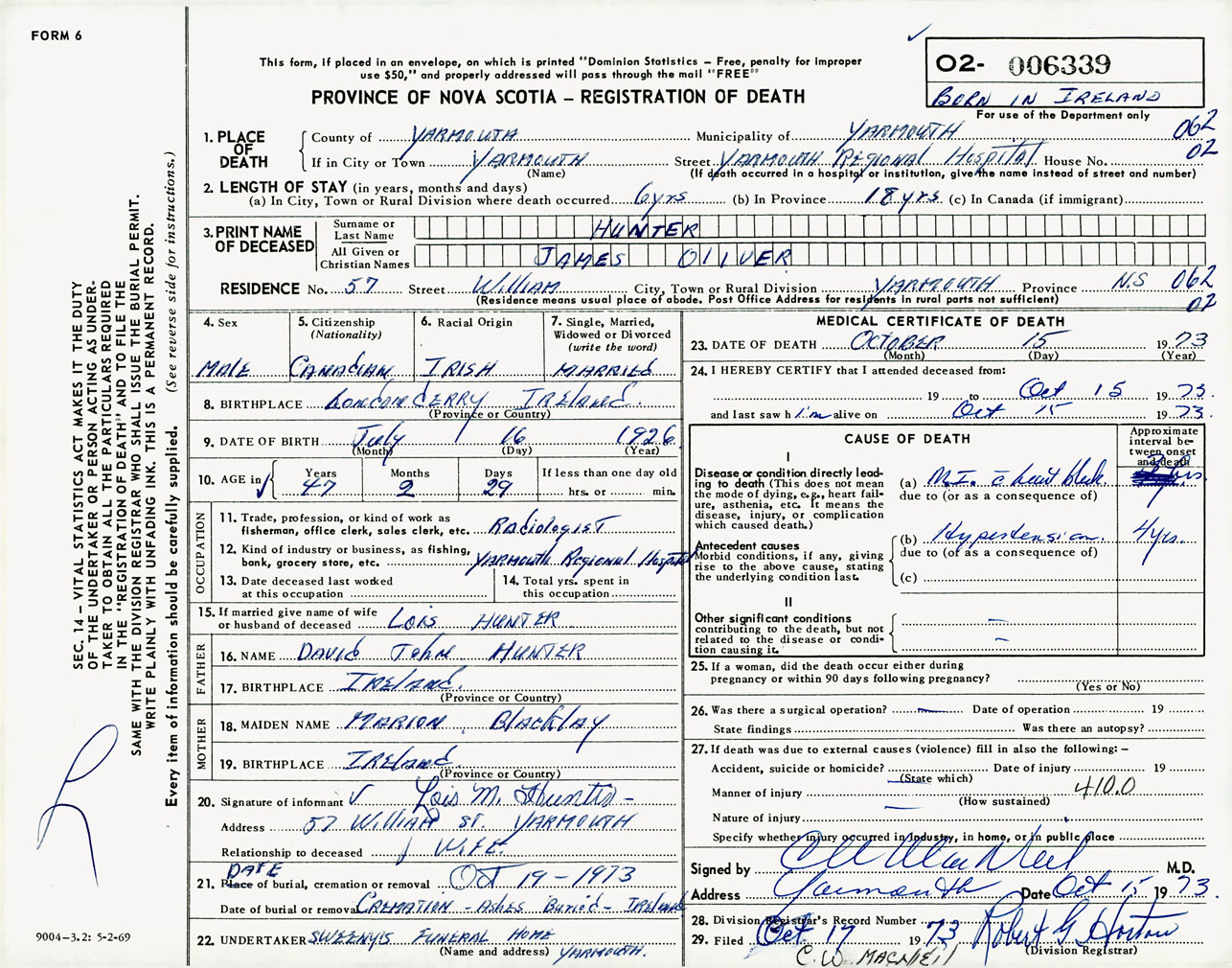 Male Death Registration: Year: 1973 number: 6339