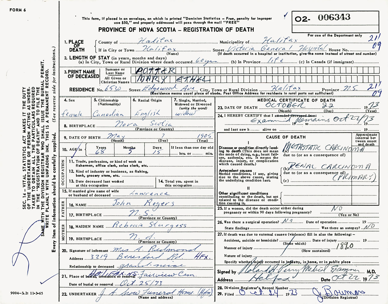 Female Death Registration: Year: 1973 number: 6343