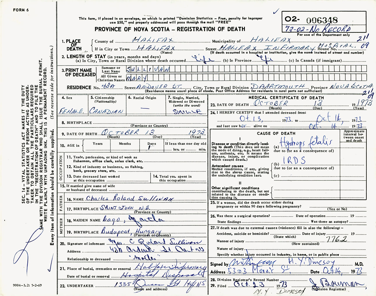 Female Death Registration: Year: 1973 number: 6348