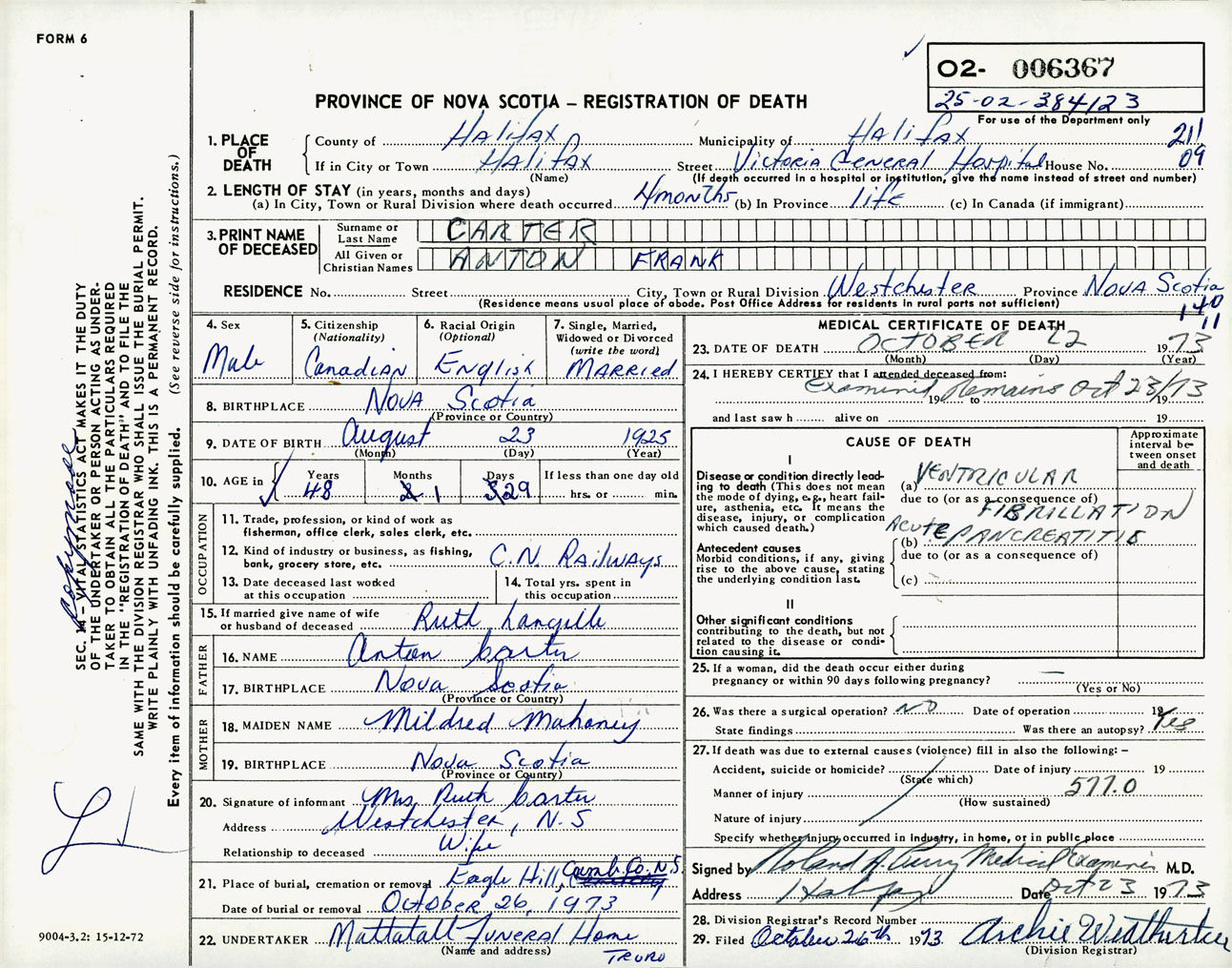 Male Death Registration: Year: 1973 number: 6367